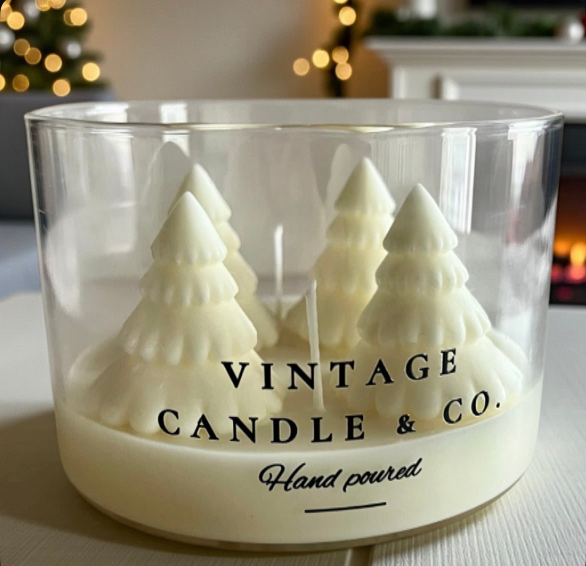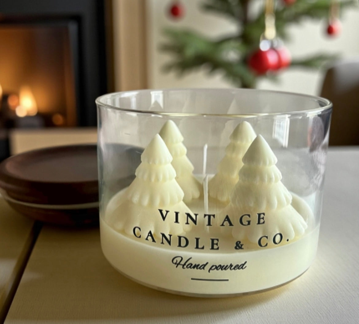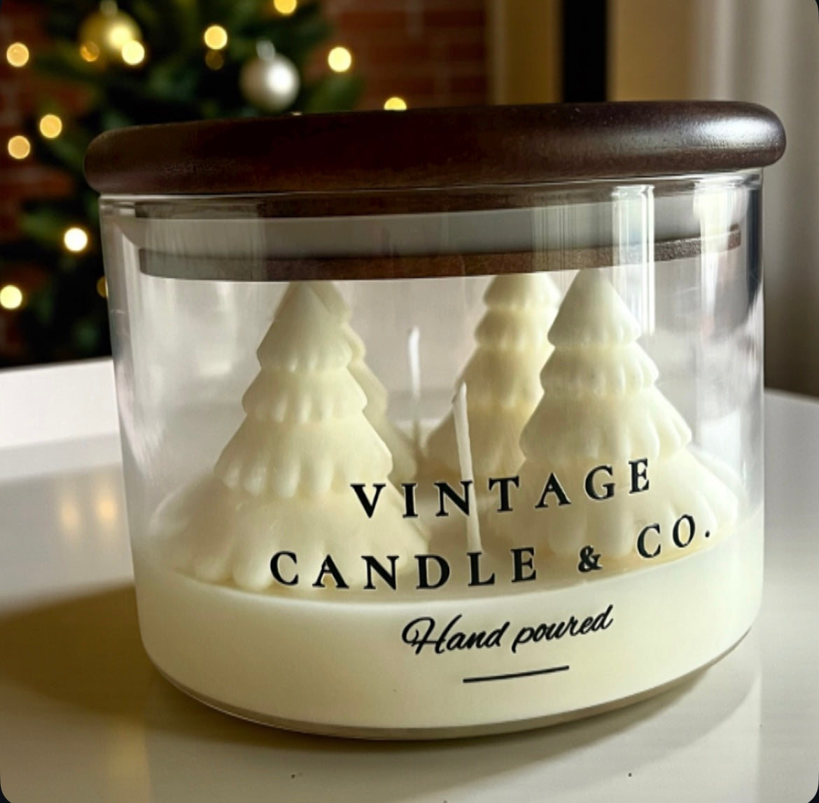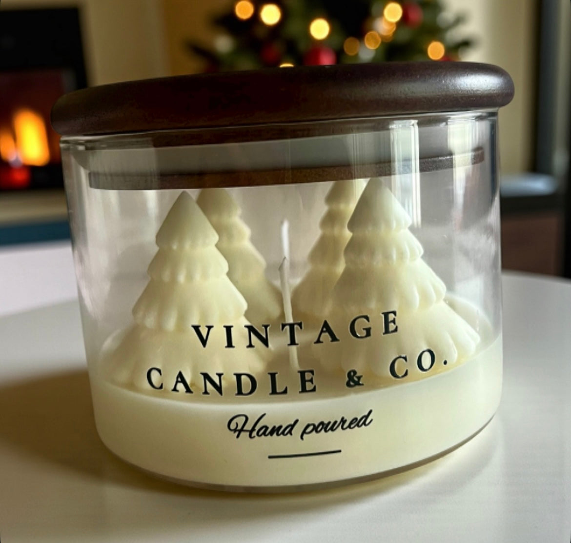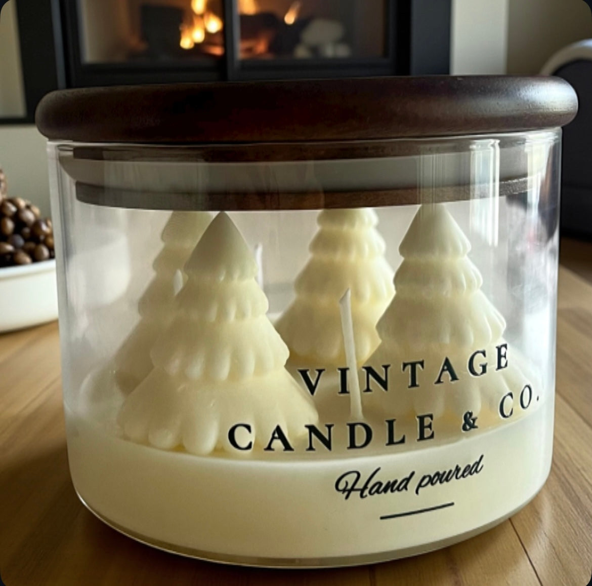 Our Farm Christmas glass vessel brings rustic holiday charm to life with 4 majestic trees and 4 glowing wicks. This isn't just a candle—it's a winter scene captured in glass, topped with a wooden lid that completes the farmhouse aesthetic.